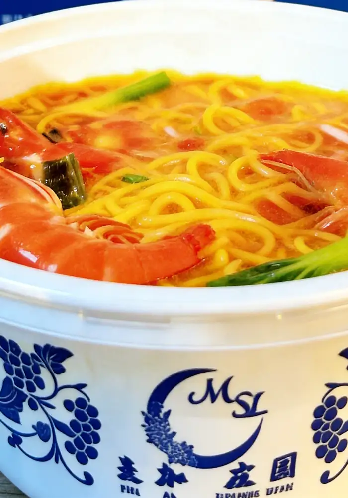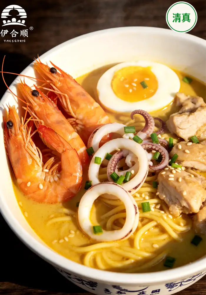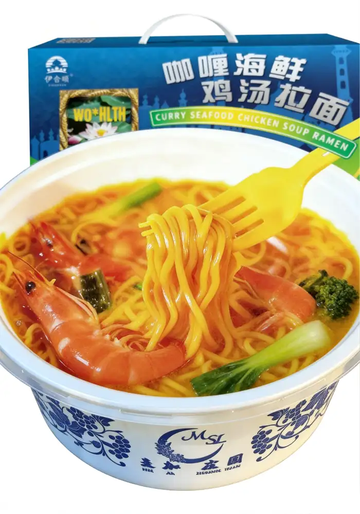 Experience a bold fusion of Southeast Asian curry and traditional Chinese chicken broth. Our Curry Seafood Chicken Soup Ramen features a rich, creamy soup base slow‑simmered with premium chicken, fresh seafood, and a blend of authentic curry spices and coconut milk. The noodles are crafted from high‑quality wheat flour, delivering a springy, satisfying texture that holds the flavorful broth perfectly. Each 150g box includes a separate spice pack and dried seafood & vegetable pack – simply add hot water or heat for 3‑5 minutes. Moderately spicy with a fragrant coconut finish, it’s an ideal meal for lunch, dinner, or a late‑night craving. Fully halal‑certified, no artificial colors or preservatives. This carton contains 6 individual boxes – great for home stocking, office pantries, or family meals. Enjoy the taste of Asian fusion comfort in minutes.